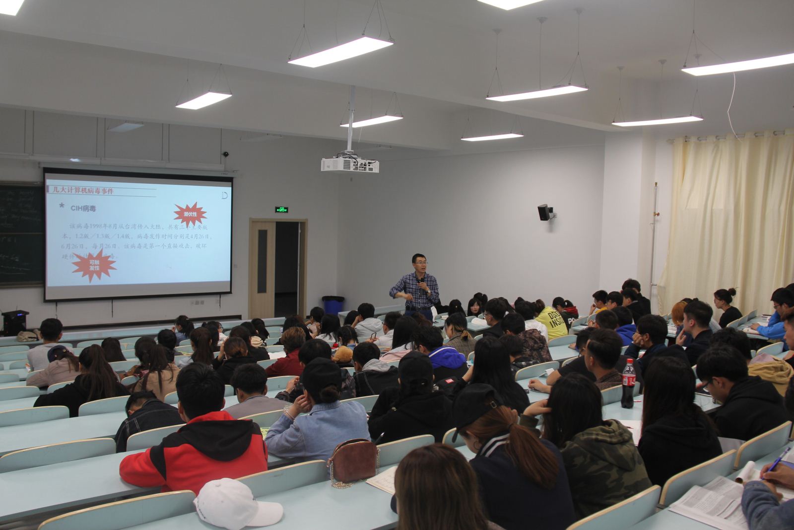 韩维良书记首先给大家介绍了几大计算机病毒事件,如蠕虫病毒、CIH病毒、爱虫病毒等等,并给同学们分析了各种病毒的传播方法和发作原理以及设计和制作病毒的目的。讲授过程中,他以自己电脑中病毒的亲身经历,来分析了病毒的各种传播机制,详细给同学们讲解了计算机病毒的防范措施。除了病毒之外,韩书记还向大家介绍了木马程序、网络钓鱼等程序的运行方式及防范技术。