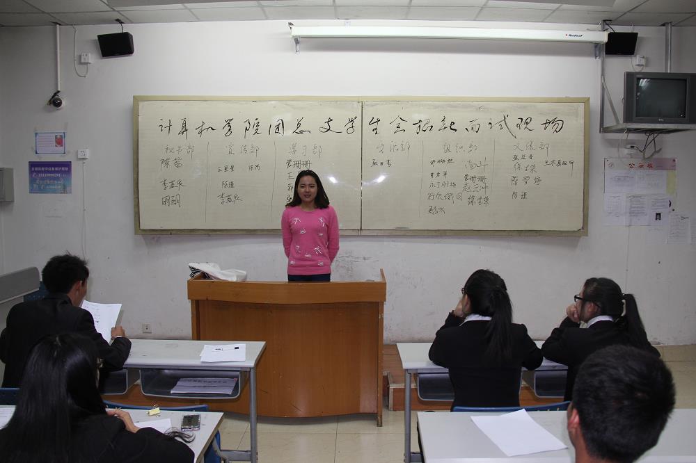 公司各社团在不同的教室对新成员进行面试。同学们的到来让整个面试的会场充满活跃的气氛,尽管教室座位不够坐,但并没有打消同学们参加面试的念头,每位同学都是以饱满、积极、热情的态度来参加面试,耐心地等待这各社团负责人叫自己的名字来进行面试。面试途中,各社团负责人秉承“公平、公正、公开”的原则对待每一位面试者,而面试者对每位负责人所提的问题都回答的很精彩。各社团的新干事也积极主动的配合各负责人来进行面试。使整个面试工作有条不紊的进行。
