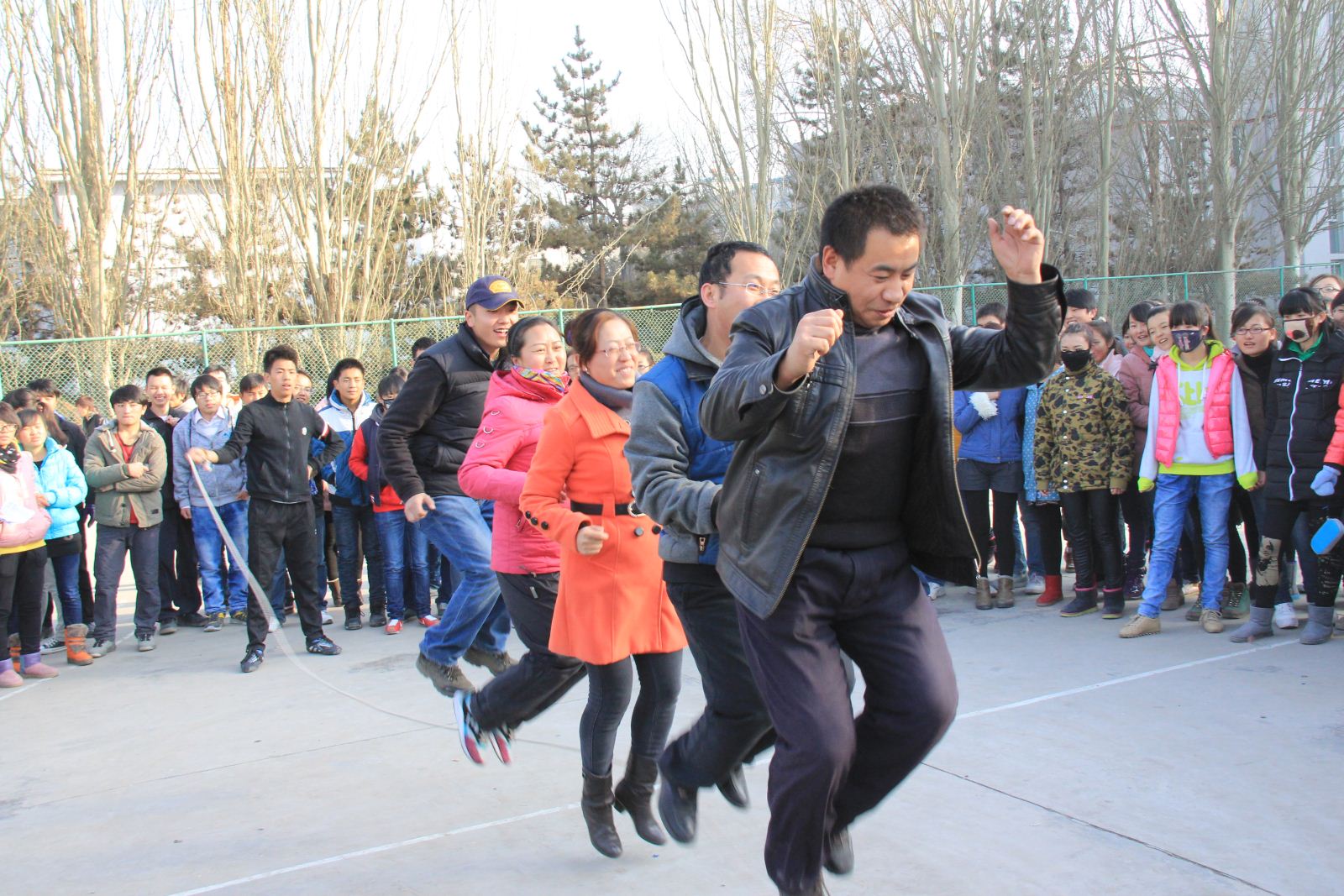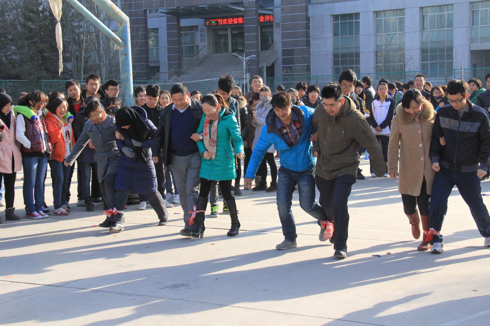 此次趣味运动会以“乐此不疲,趣味竞技”为主题,比赛项目趣味性十足,竞技性强。活动还未开始,操场上的氛围就格外热烈,同学们拉横幅、圈场地、再次确定参赛人的名单。在同学们的充分准备后,比赛正式开始。首先是集体赛中两人一组的“背靠背、心连心”的比赛项目,在同学们的呐喊声中,只见参赛队员背靠着背手挽着手小心翼翼的保护着两背间的气球一起跳跃向前。接着是“袋鼠跳”,参赛同学手脚一致奋力拼搏的样子更是掀起一阵阵高潮。随后同学们又进行了“三人四足”、“乒乓球接力赛”和“集体大跳绳”的比赛,同学们在比赛中既紧张又努力的神情感染着在场每一个人,引发全场人员一次又一次的欢呼,使观看比赛的同学们时而奋尽全力为参赛同学加油鼓劲,时而捧腹大笑。其间各位老师也是热情高涨,“乒乓球接力”、“集体大跳绳”等每一项比赛都竭尽全力力争第一。在一片片欢声笑语中,老师争相在限定时间内进行比赛,女老师们更是巾帼不让须眉,也奋力一搏。比赛结束后,同学们和老师们一起领奖并留影纪念。在清理活动现场后,大家都依依不舍的离开比赛场地。
