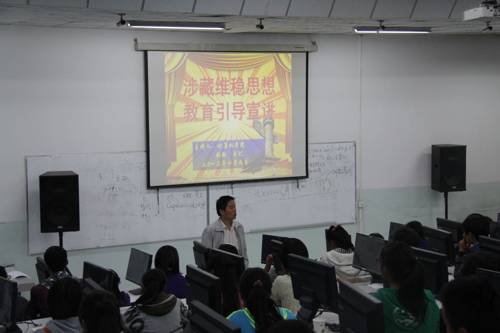 为认真贯彻落实公司《关于做好涉藏维稳思想教育引导宣讲工作回头看的通知》精神,2013年10月9日15:40在公司二楼多媒体教室,专门组织开展了“涉藏维稳思想教育引导宣讲”的学习活动。此次学习活动由党总支书记张韧主讲,13级全体新生及部分没有接受宣讲的员工参加了此次学习。