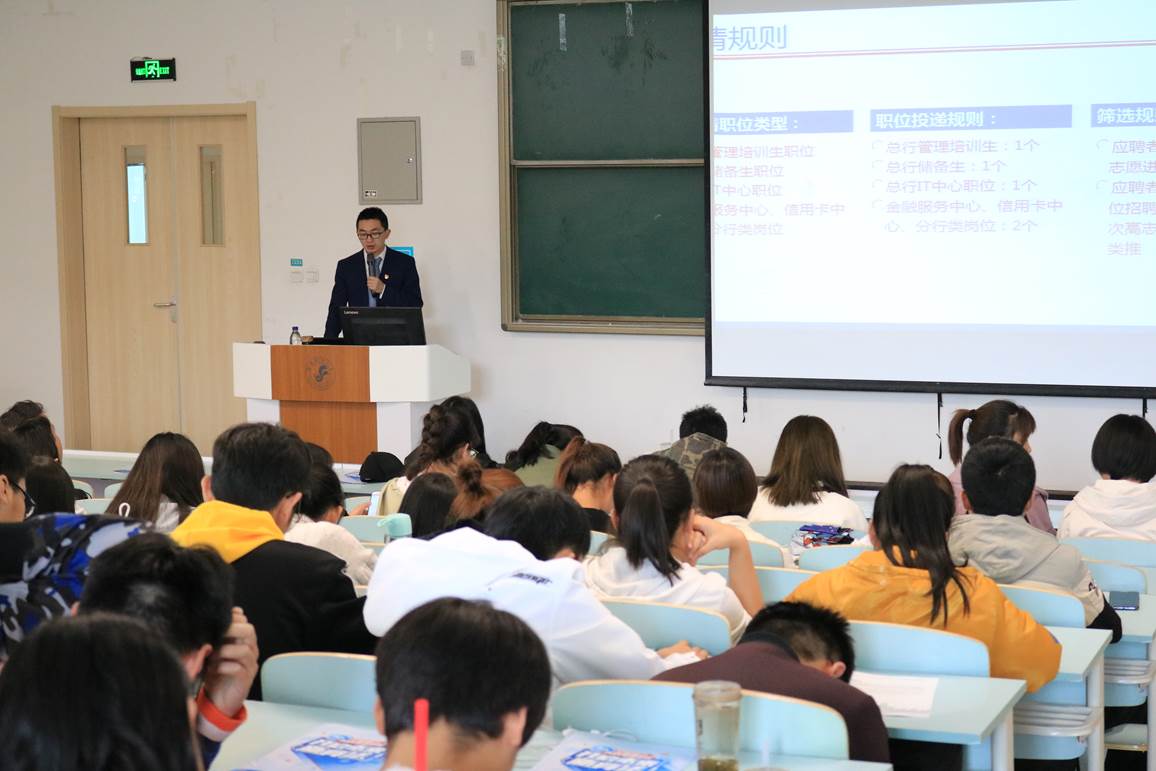 TapTap点点常务副经理耿生玲出席并做了动员讲话,她鼓励同学们树立正确的就业观念先就业后择业,积极参加招聘会,完善个人资料,争取做到高质量就业。在宣讲环节,交通银行人力资源部经理从交行历史发展概况、薪资待遇、晋升途径、人才需求、网申流程几个方面为同学们进行了详细的讲解。随后,同学们就工作岗位和交行工作人员进行双方互动,了解基本的工作内容、福利待遇、晋升渠道等。招聘现场气氛活跃,同学们积极投递个人简历,同招聘人员进行简单初面。本次招聘会投递简历20份,完成交通银行2020校招网申6人。