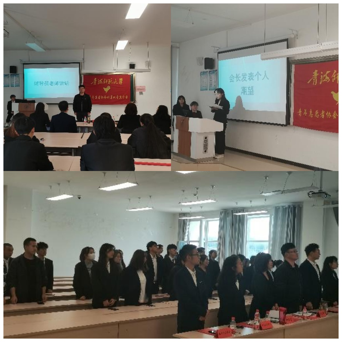 会议伊始,全体起立奏唱《青年志愿者之歌》,大家的歌声慷慨激昂,铿锵有力。会长刘雪代表第八届青协做了工作总结,与大家共同回顾一年来青协的点点滴滴和大家在活动中的优秀表现,同时也对新一届的干部们满怀信心与期望,激励他们积极工作,创造青协更加美好灿烂的明天。随后,辅导员赵丽雯老师给各部门优秀干事颁发了荣誉证书,并为青协第九届干部颁发聘书。新任会长柴生斌代表第九届青协组成人员进行了表态发言,表示将以最高的热情,认真负责地做好各项工作,使公司青年志愿者协会的工作有新突破。