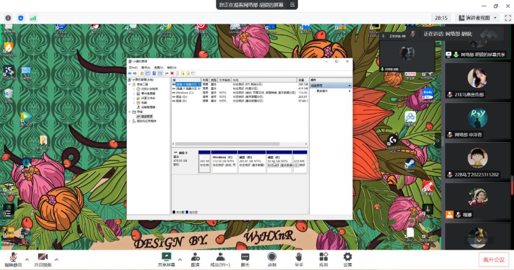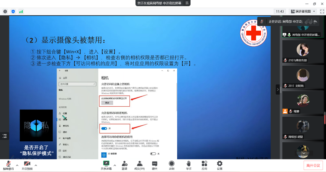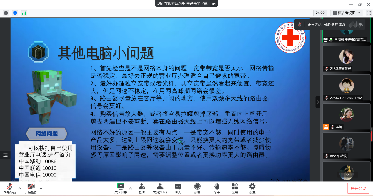 活动第一项:由网络部申洋奇同学就同学们在网课过程中遇到的一些电脑问题进行了讲解。主要问题及解决办法如下: